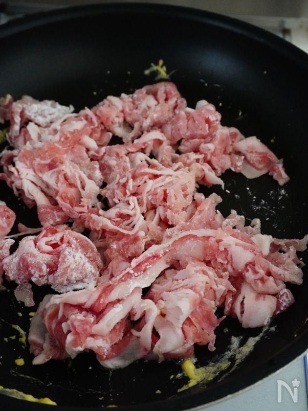 (2) 豚ロース薄切り肉に塩こしょうを振り、片栗粉を振りかけ薄くまぶす。サラダ油をひいたフライパンで焼き目がつくまで焼く。