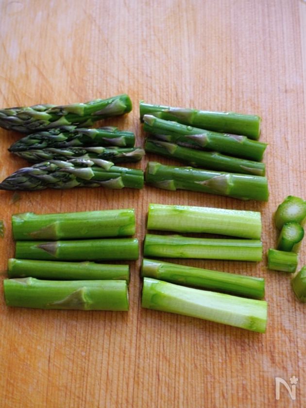 (下準備) ・アスパラガスは根本を切り落とし、根本側を5㎝程度ピーラーで皮を剥き、4等分に切り分ける。耐熱容器に入れ、500wの電子レンジで2分加熱する。