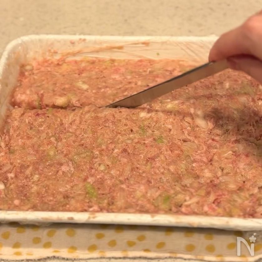 (1) バットに豚ひき肉、キャベツ、玉ねぎ、【A】を入れて粘り気が出るまでよく捏ねる。