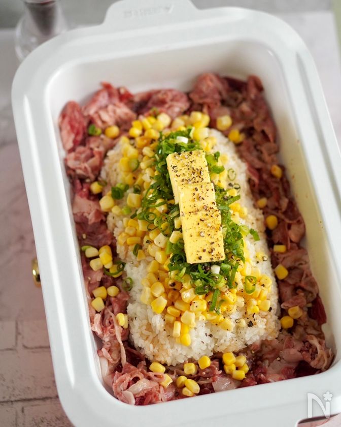 (3) ホットプレートにオリーブオイルをひき、中心に炊いた白米、スイートコーン、青ネギ、無塩バターを乗せ、ブラックペッパーをかける。