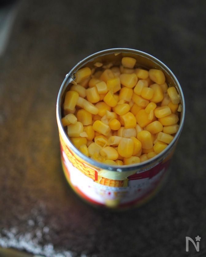 (下準備) スイートコーン缶を開け、水を出しておく。