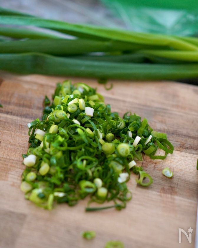 (1) 青ネギを水洗いして泥を落とし、小口切りにする。