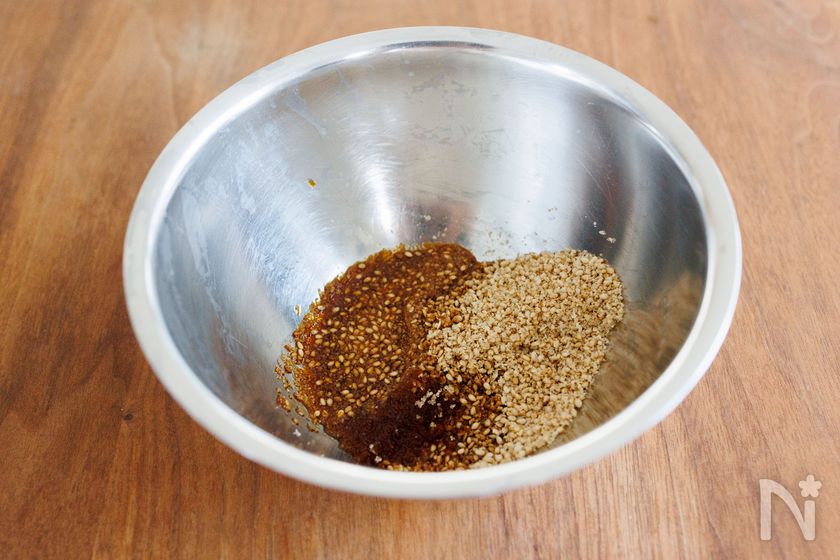 ◯すりごまと調味料をよく混ぜ合わせてから、野菜を和えてください。