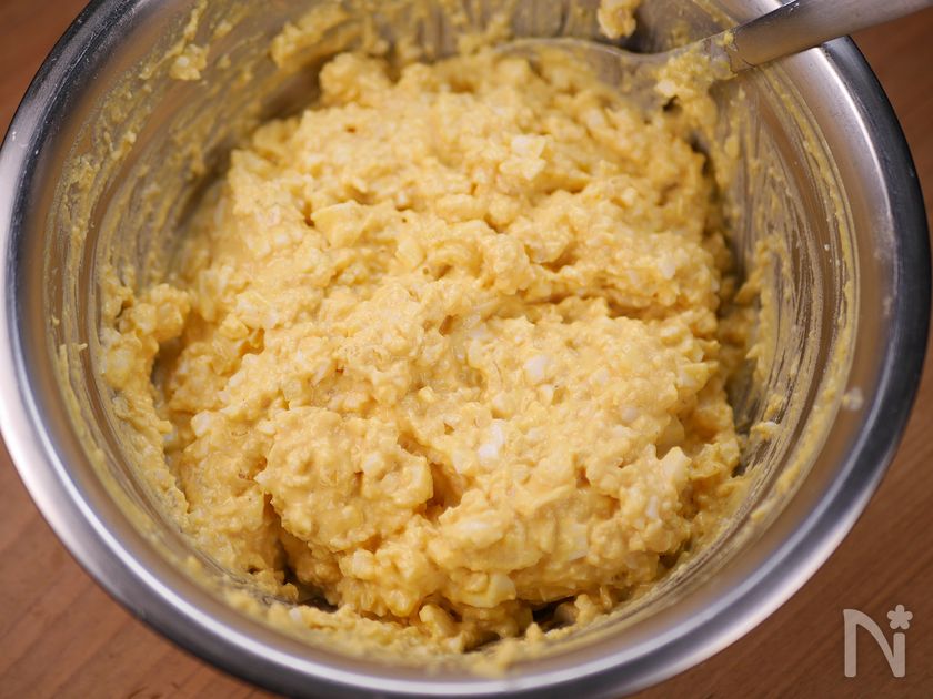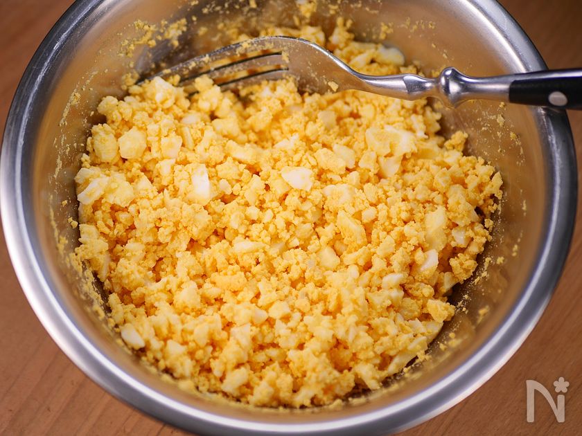 (2) ボウルにゆで卵を入れ、フォークの背でつぶして細かくする。