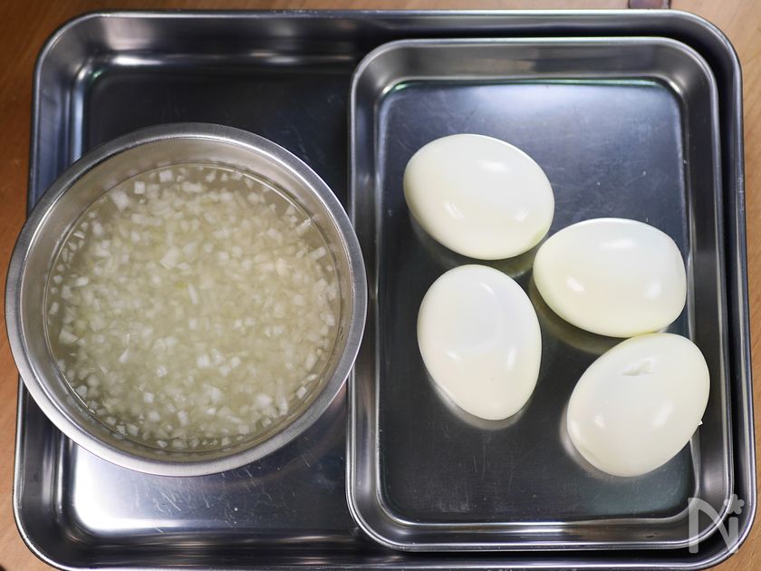 ○玉ねぎはみじん切りにしてしばらく水にさらす。