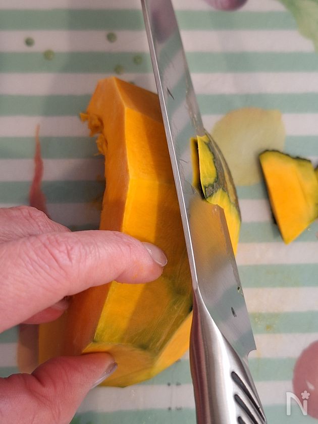 (6) ※かぼちゃの皮を剥くときは、平らな面を下にして置き、しっかり持って皮を削ぐように切ります。(包丁の刃は常に下向き)