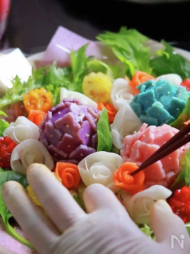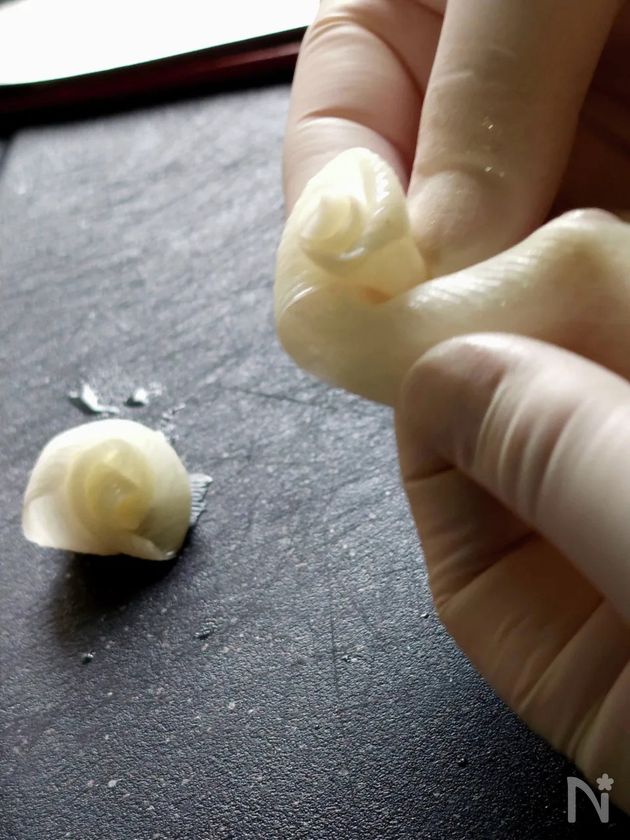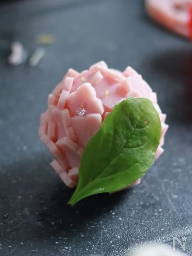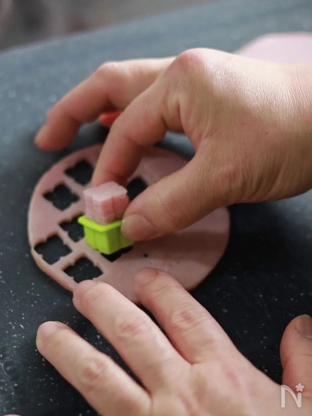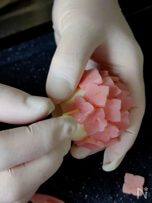 (2) 1のハムを浸している間にピンクのあじさいを作る。ハム2枚を花びらの型で抜く。