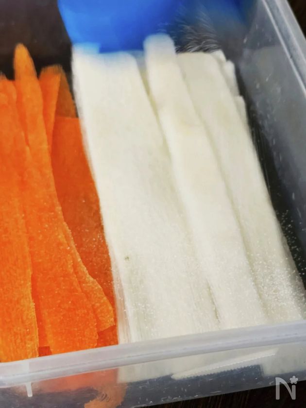 (7) 大根と人参をピーラーで薄くスライスして、かるく塩をふる。