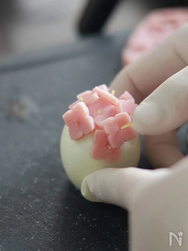 (3) ゆで卵の尖ったほうを少し切って自立するようにしてから、2で、花びらの形に抜いたハムをサラスパでとめる。
