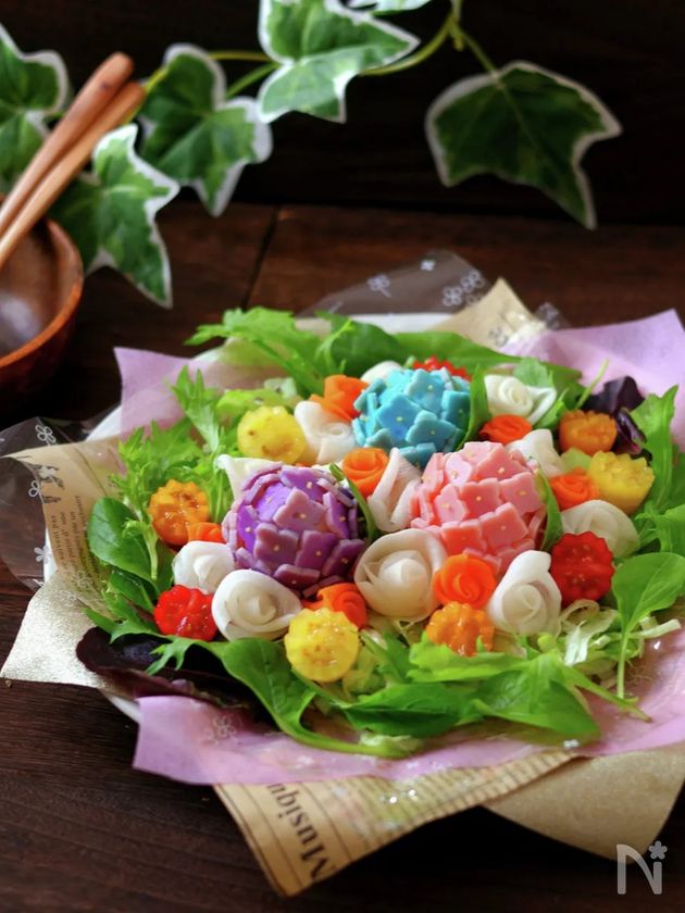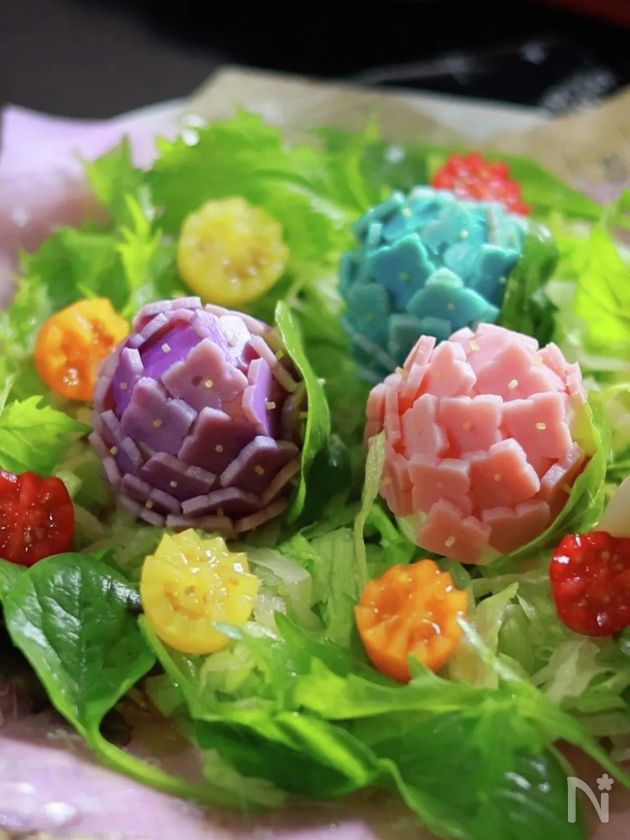 (12) ゆで卵とハムのあじさいをのせて、まわりにベビーリーフをかざる。