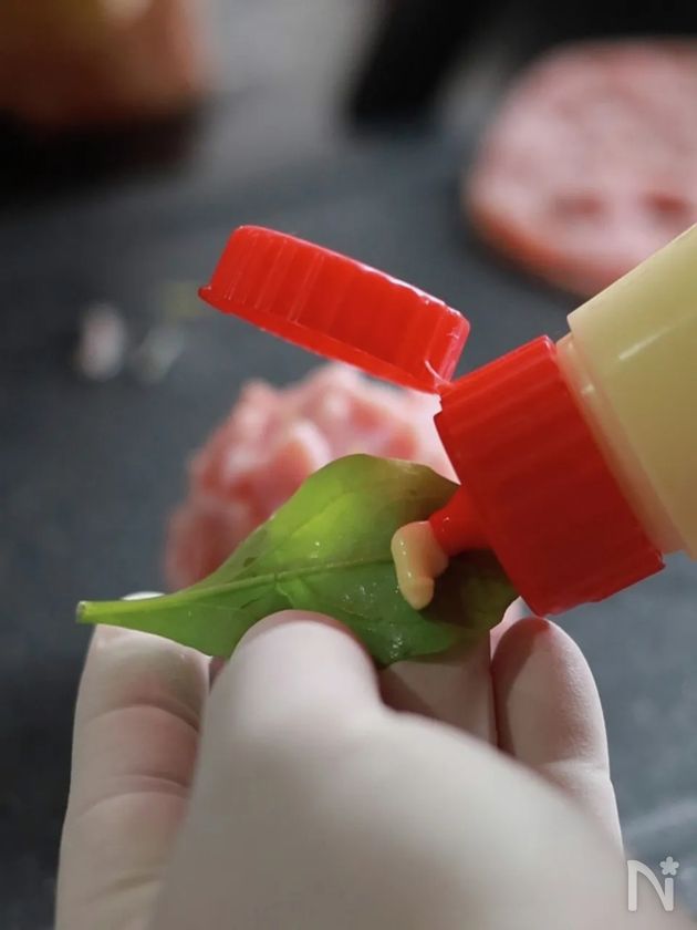 (5) ベビーリーフ(ルッコラなど)の後ろにマヨネーズをつけて、