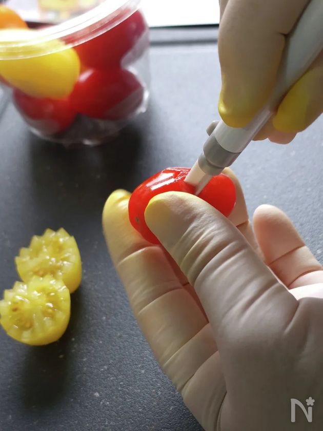 (10) ミニトマトをギザギザに一周カットしてお花のようにする。