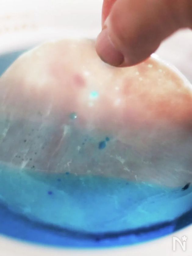 (1) 水色・紫のあじさい用に、アイシングカラーまたは食用色素(紫・青)を少し溶かした色水にハムを浸す。(紫に2枚、青に2枚)