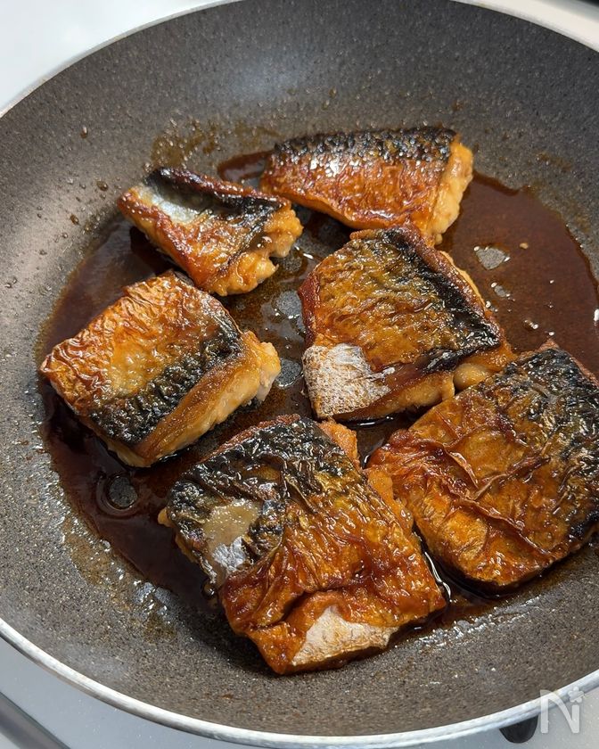 (5) 照りが出てきたらさばを裏返し、タレを絡めながら30秒ほど煮て火を止める。
