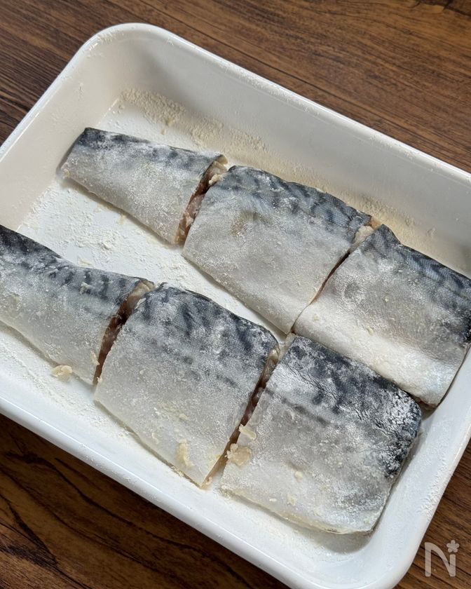 (1) 無塩さば(半身)は3等分に切り、全体に薄力粉をまぶす。余分な粉は軽くはたく。