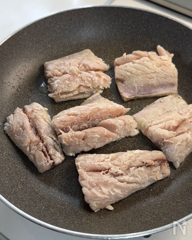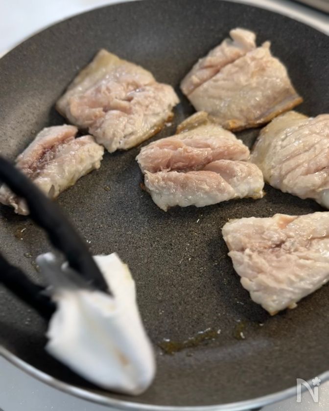 (3) 周りが白く色づいてきたらいったん火を止め、フライパンに残った油をペーパータオルでしっかり拭き取る。