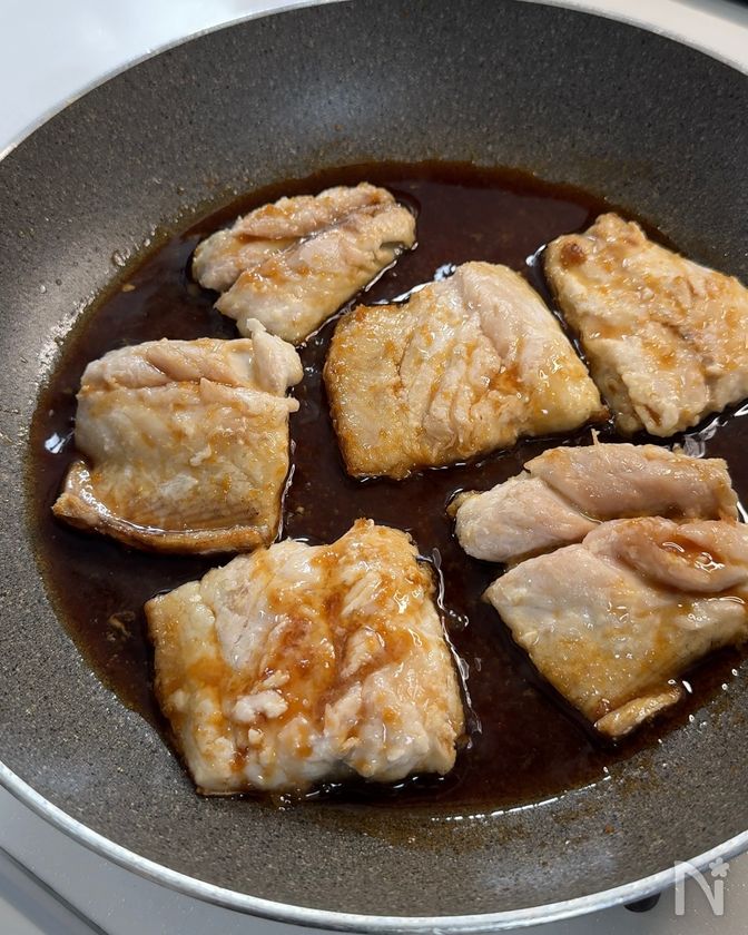 (4) フライパンに合わせ調味料を加えて再び弱火にかけ、スプーンでタレを回しかけながら煮からめる。