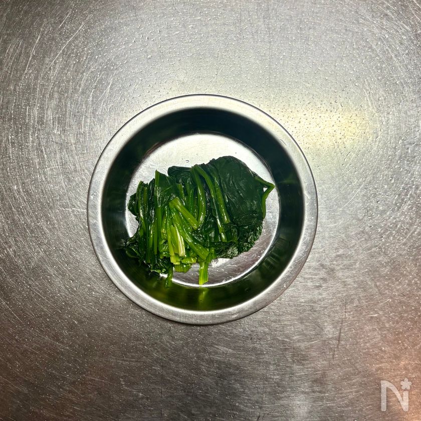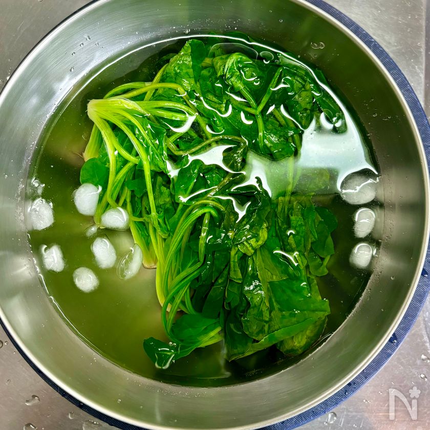 ほうれんそうを塩分濃度の濃い湯でゆでてしっかり塩味をつけることで、味がまとまる。