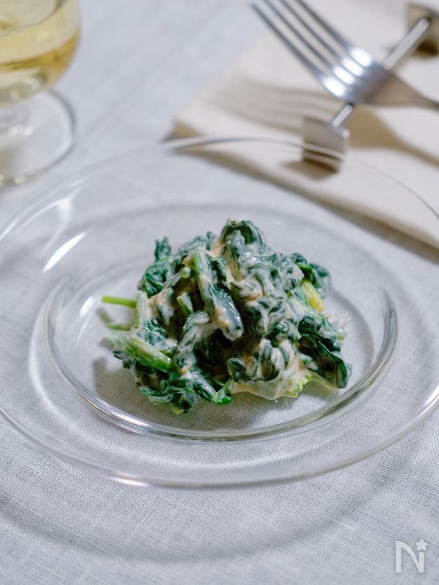 (4) ②のほうれんそうの水気を再び絞って③のボウルに入れ、さっくりとあえて器に盛る。