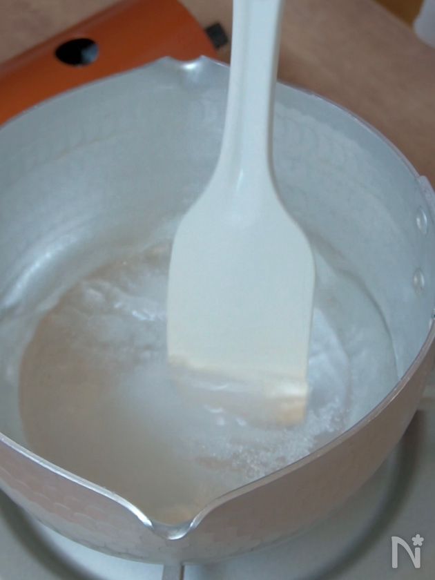 【D】を鍋に入れて温め、沸騰直前で火を止めて、ふやかした【B】を入れて溶かす。氷水にあてながら冷たくなる程度に冷やしてください。