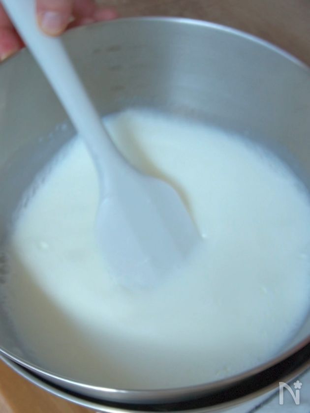 (2) 残りの半量の牛乳と、工程1の牛乳をボウルに入れて氷水にあてながらとろみがつくまで冷やす。お好みの器に流し冷蔵庫に入れて冷やす。※この工程は重要です。