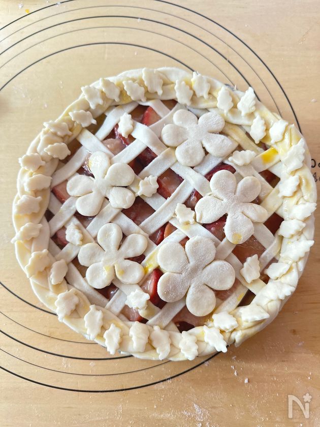 残った生地は、好みの型で抜き、全卵(艶出し用)を塗って飾りとして貼りつける。