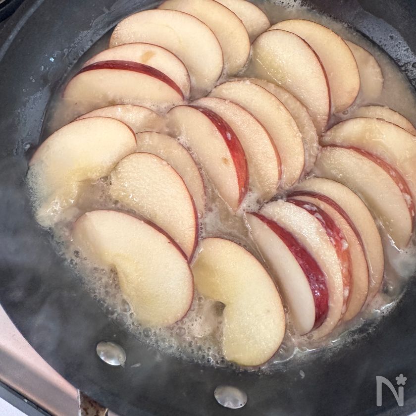 (下準備) りんご(小)はよく洗い、くし切りの薄切りにする。