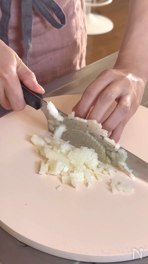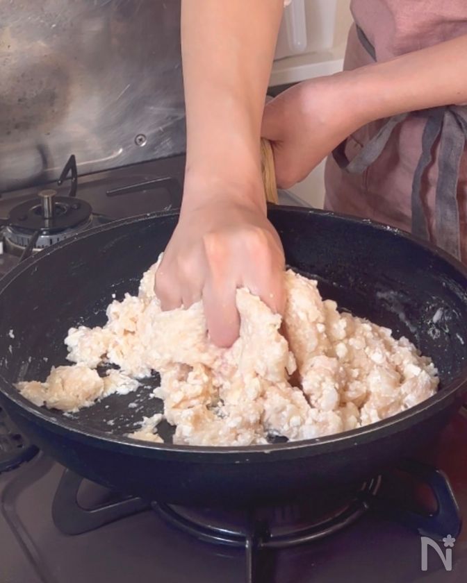 (2) 冷たいフライパンに鶏ひき肉、木綿豆腐、玉ねぎ、卵白、【A】を入れる。