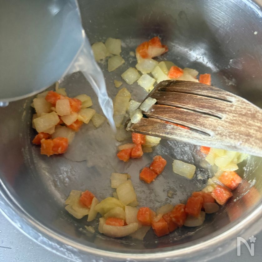 玉ねぎが色づかない程度の火加減で3分ほど炒めたら、小麦粉を加え、粉っぽさが無くなるまで、焦がさないように炒め合わせる。