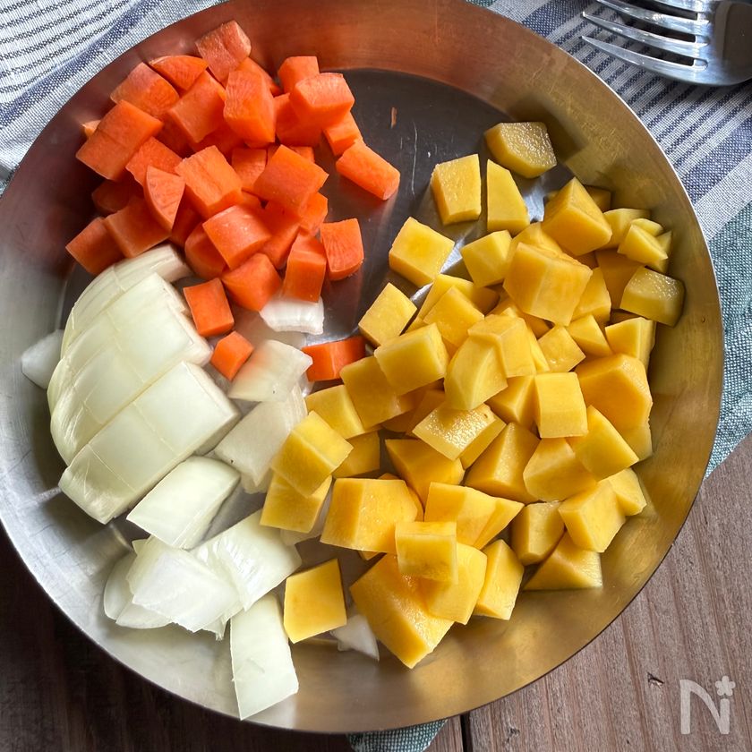 (2) 玉ねぎ、じゃがいもは1cm角、にんじんは8mm角に切る。