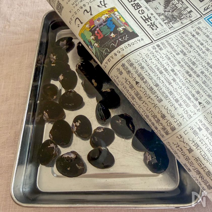 (下準備) しじみは水400mlに塩4g(1%の塩水)を溶かした中にしじみ同士が重ならないように浸し、新聞紙などで覆って冷暗所で1時間ほど置いて砂を吐かせる。