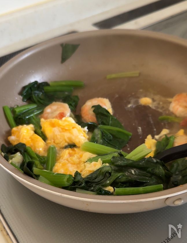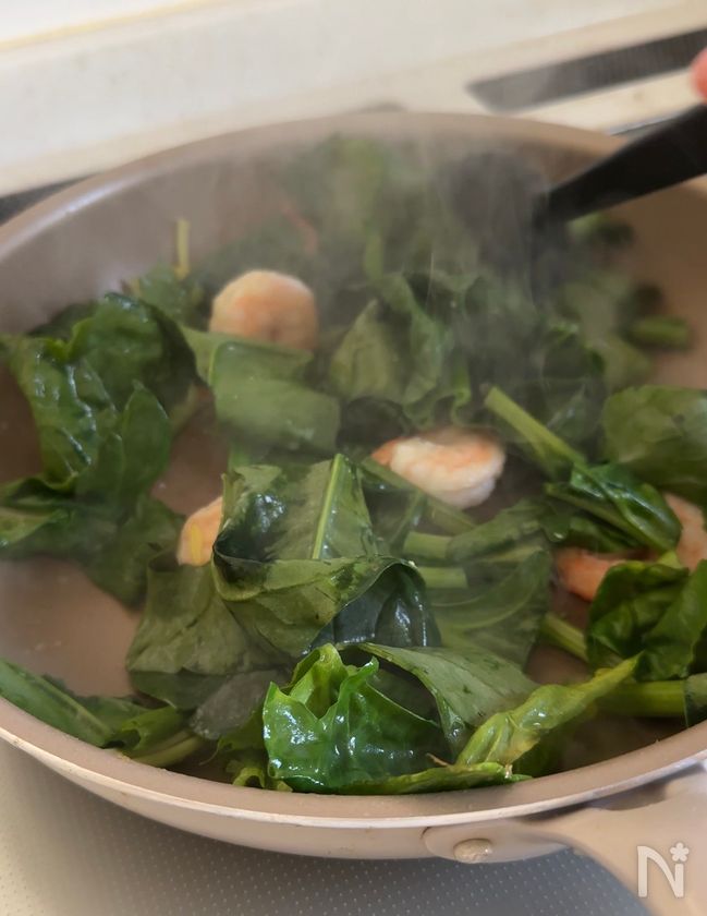 8割ほど火が通ったら水気を切ったほうれん草を加えて炒め、1分〜1分30秒ほど炒める。