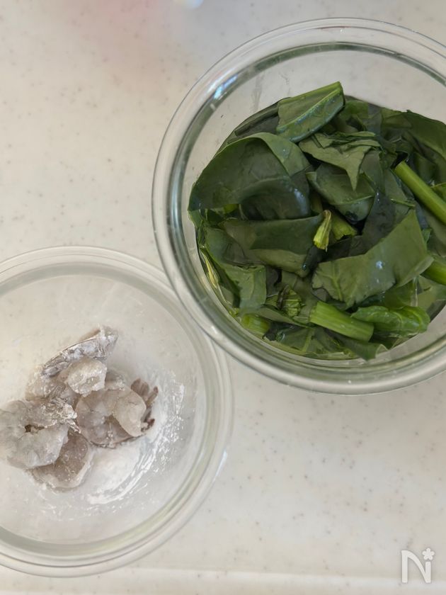 (1) むき海老は背わたを取る。キッチンペーパーで水分を拭き取り、片栗粉をまぶす。