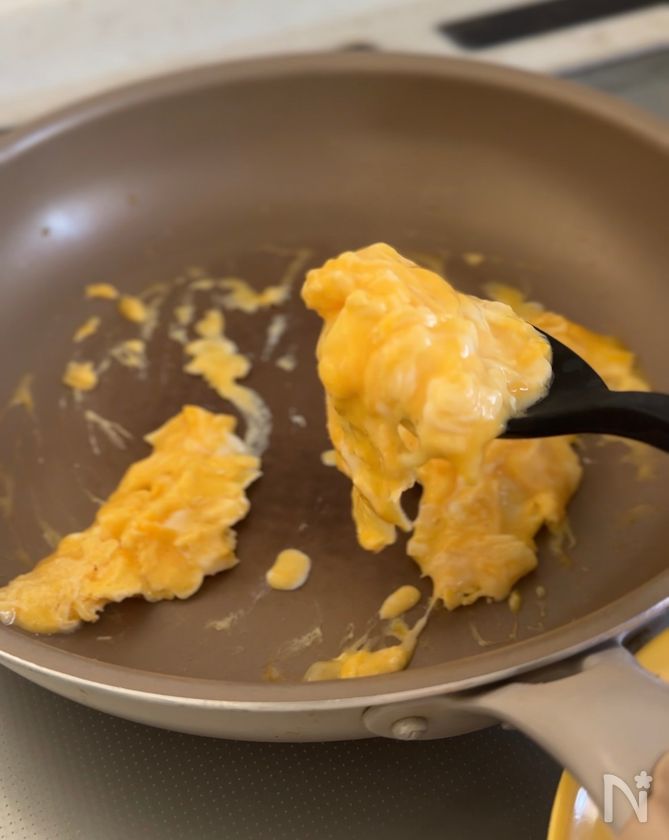 (4) 混ぜ合わせた【A】を加えてとろみがつくまで煮る。卵を戻し入れて混ぜる。