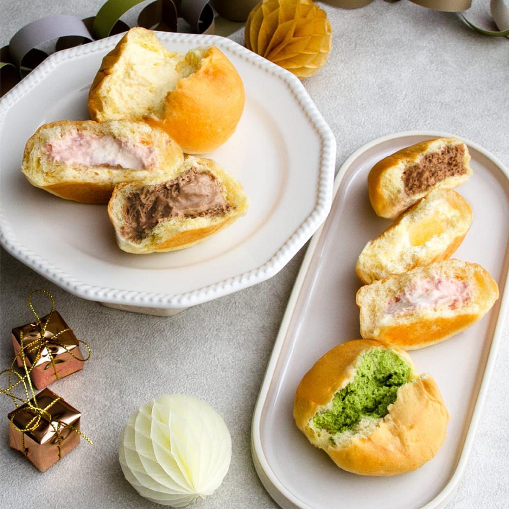くりーむパン(カスタード・チョコレート・レモン・抹茶・あまおう苺ミルク)×各2個ずつ入ったバラエティ豊かな詰合せ。