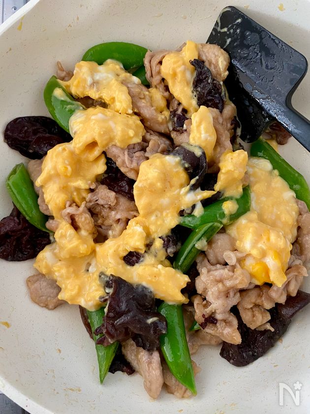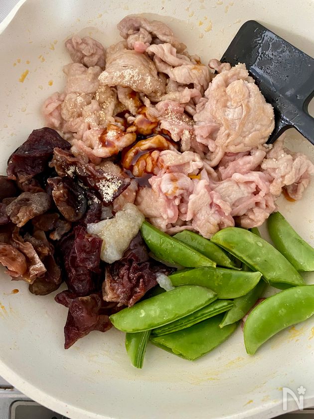 (3) 生キクラゲ・スナップえんどう・【B】をフライパンに加え、中火で3分ほど炒める。