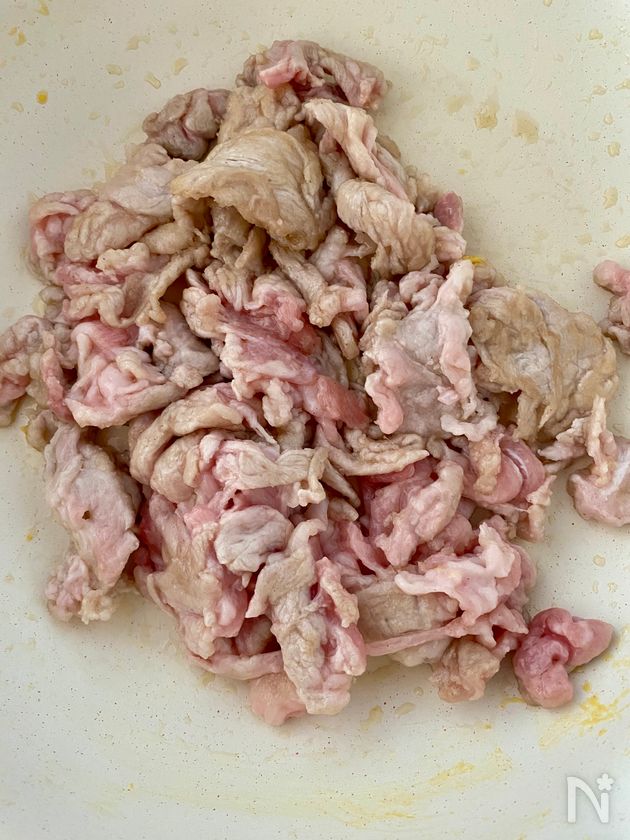 (下準備) 豚こまはひと口大にちぎり、塩こしょう(分量外)を少々振り、片栗粉をまぶす。