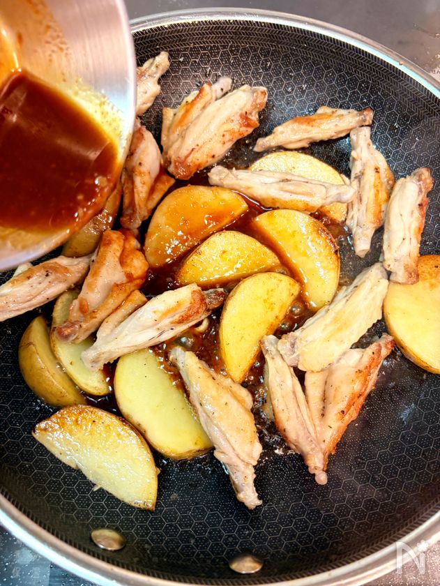 鶏肉と新じゃがにしっかり焼き目を付けてから調味料を絡めるのがポイントです!