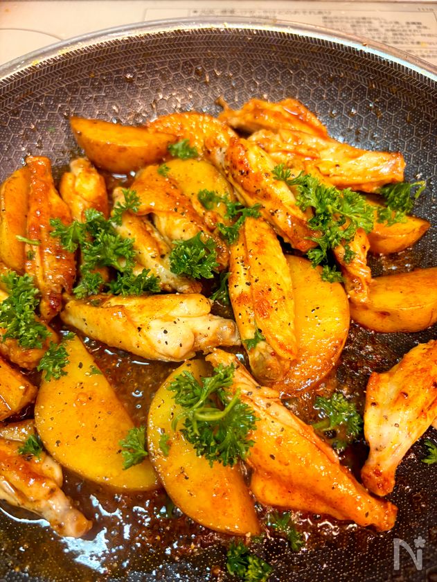 鶏手羽中と新じゃがのニンニクコチュ醤油がらめ