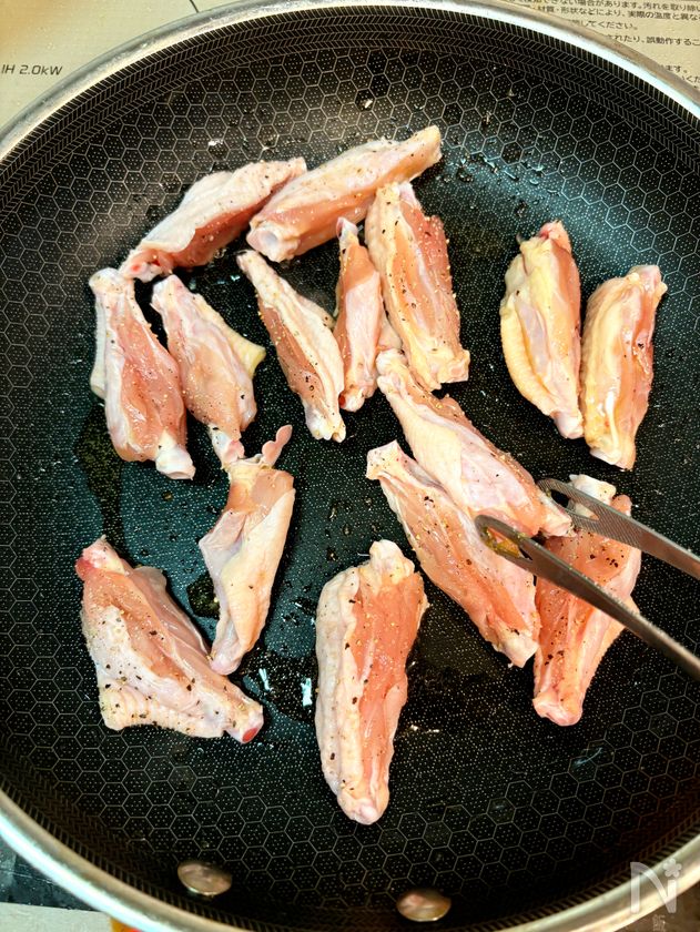 鶏手羽中に塩こしょうで下味をつける。