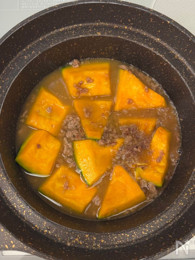 (2) ひき肉に火が通ったら、かぼちゃを入れ、油が回る程度炒める。