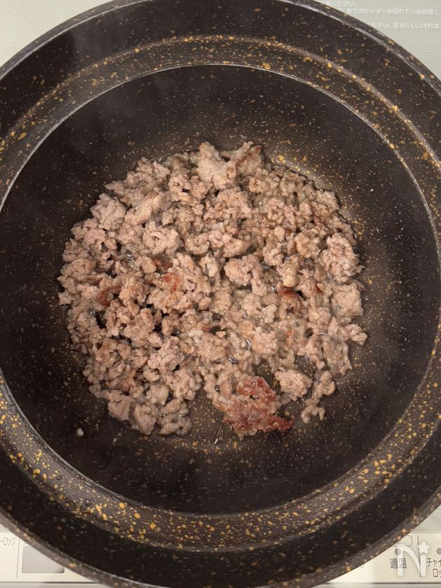 (1) フライパンにごま油を引き、豚ひき肉を中火で炒める。