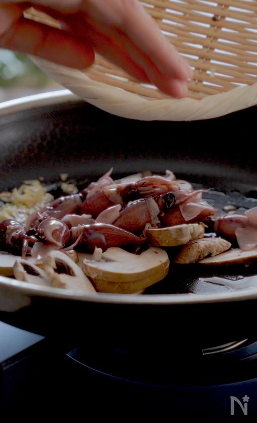 (2) フライパンに、オリーブオイル、ニンニクを入れ、香りが出てきたら、ホタルイカとマッシュルームを入れて炒める。