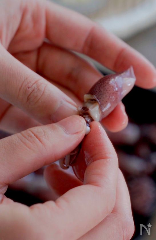 (下準備) ・ホタルイカは目玉をとり、下処理をする。