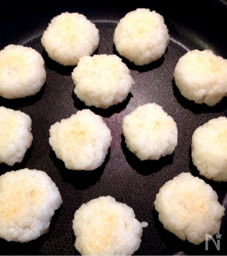 (2) お好みの粒加減まで潰したら、手にごま油を塗って平たく丸めたら、熱したフライパンで焼く。(今回は食べやすいように小さく丸くしましたが、わらじ型などお好きな形で♪)