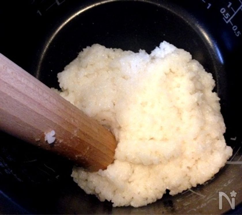 (1) 残りご飯に片栗粉を全体的にまぶしたら麺棒などで潰す。
