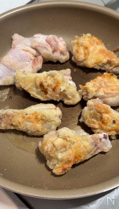 (1) 手羽元の全体に片栗粉大さじ1.5をまぶす。フライパンに油大さじ2を入れて中火で熱し、手羽元をならべて揚げ焼きにする。