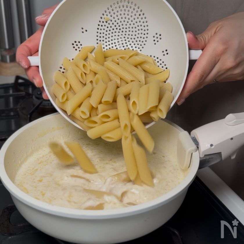 (4) しんなりしてきたら、【A】をいれる。ふつふつしてきたら茹でたペンネを入れて混ぜ合わせる。