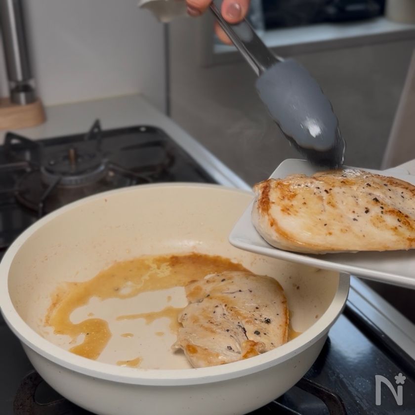(1) 鶏むね肉を半分にスライスして、塩こしょうをする。フライパンにバターを溶かしたら、お肉を入れて中弱火で蓋をして蒸し焼きにする。