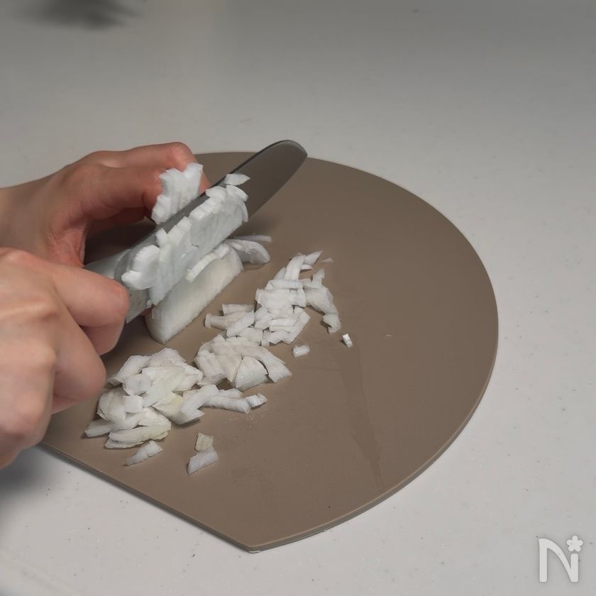 (下準備) 玉ねぎ、にんにくはみじん切り。ペンネを表示時間より2分短く茹でる。